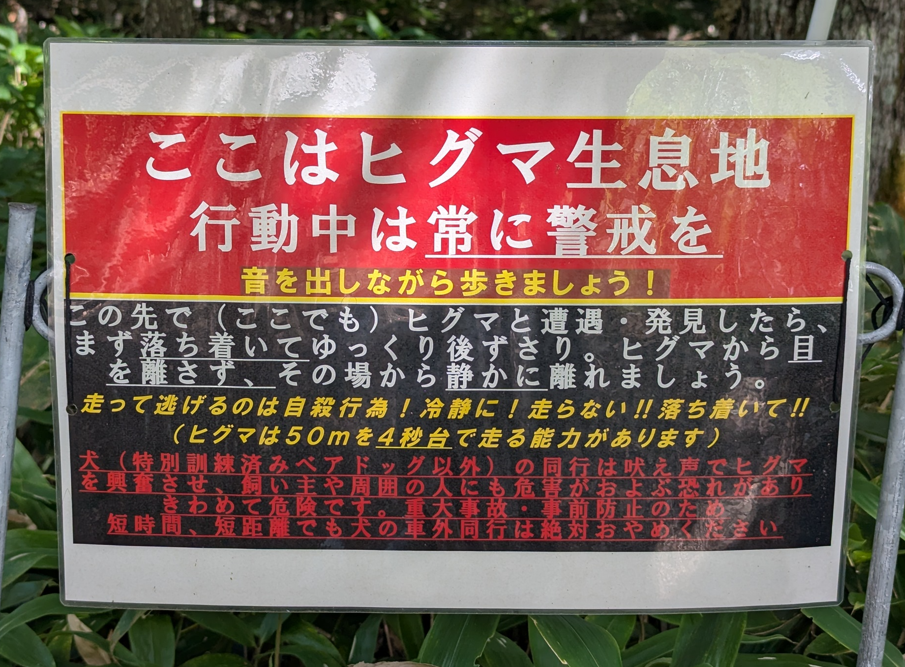 展望台は駐車場から3分ほど歩くとあるのですが、入り口に「ヒグマ注意」の看板が。